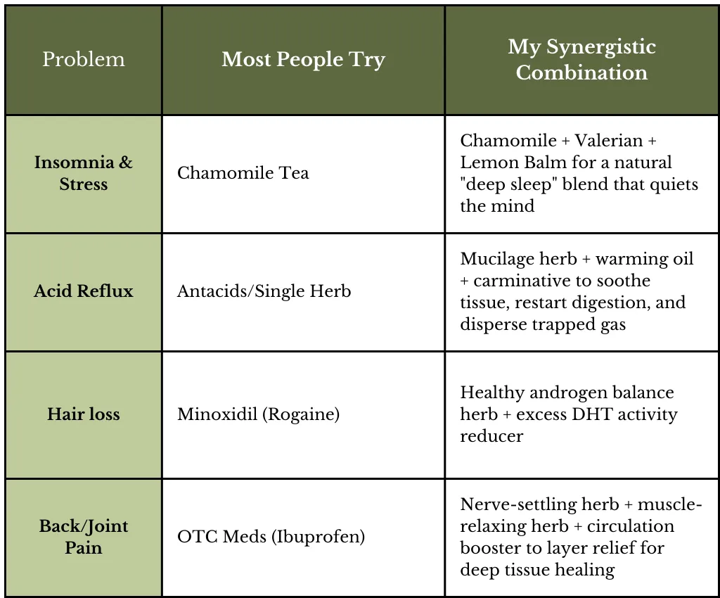 Many of the herbs include synergistic combinations — showing which plants work best together for certain problems and what each one contributes to the blend. This is the part that changed everything for me.